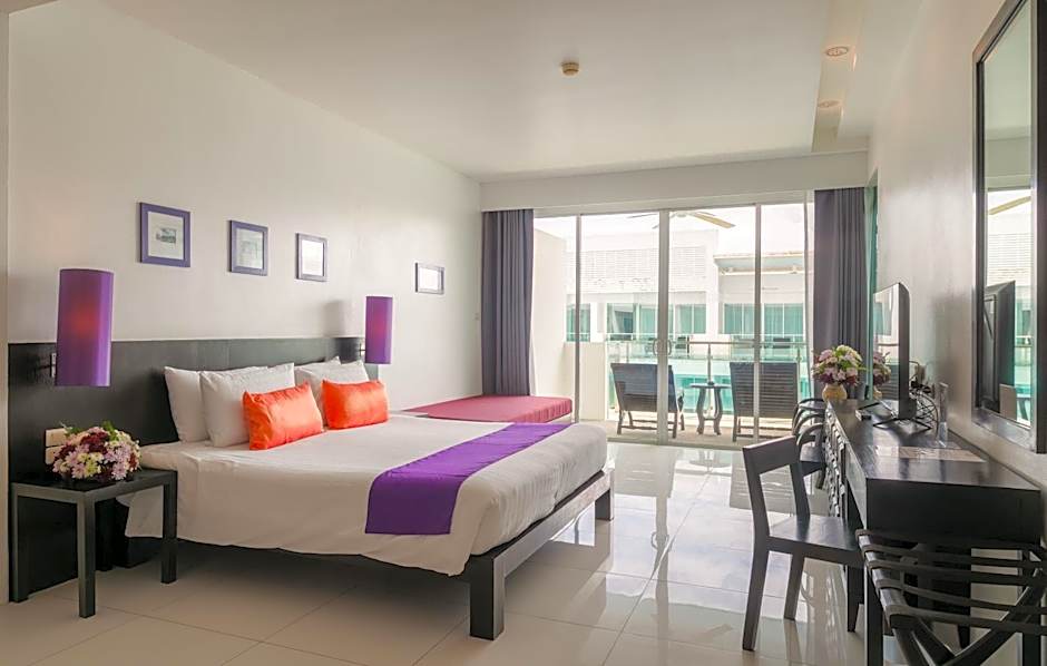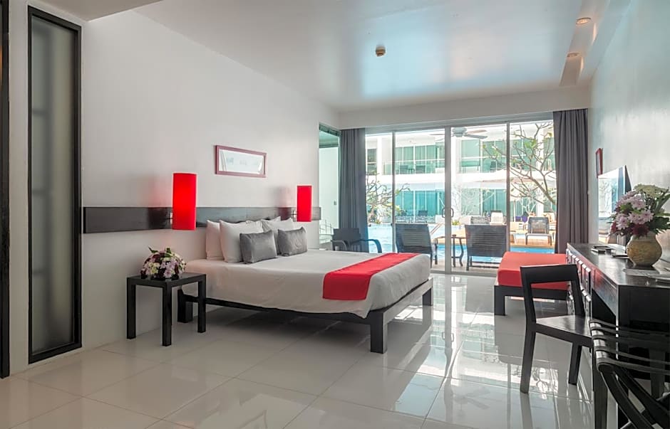 Featuring modern white-washed interiors with hints of color, this large room offers pool views, a seating area, flat-screen TV and DVD player.