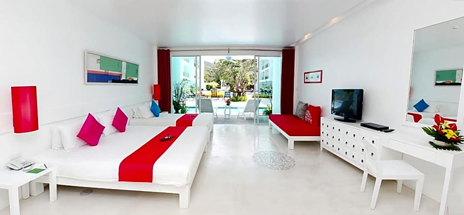 Featuring modern white-washed interiors with hints of color, this large room offers pool views, a seating area, flat-screen TV and DVD player.
